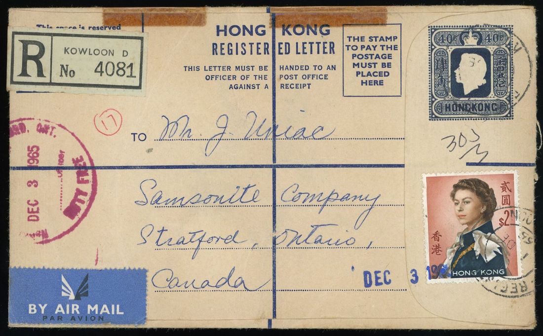 1965 (1 Dec) registered postal stationery envelope 40c uprated with $2 tied by "Registered /Kowloon"c.d.s. with registration label addressed to Canada with arrival on reverse.