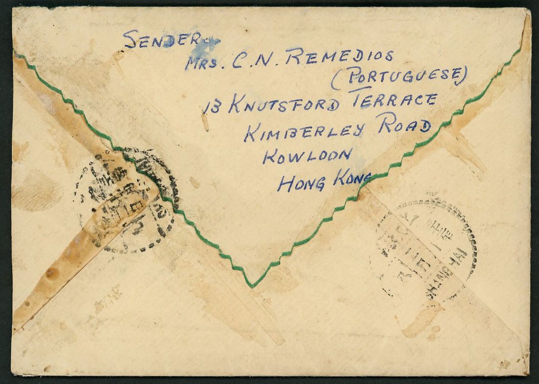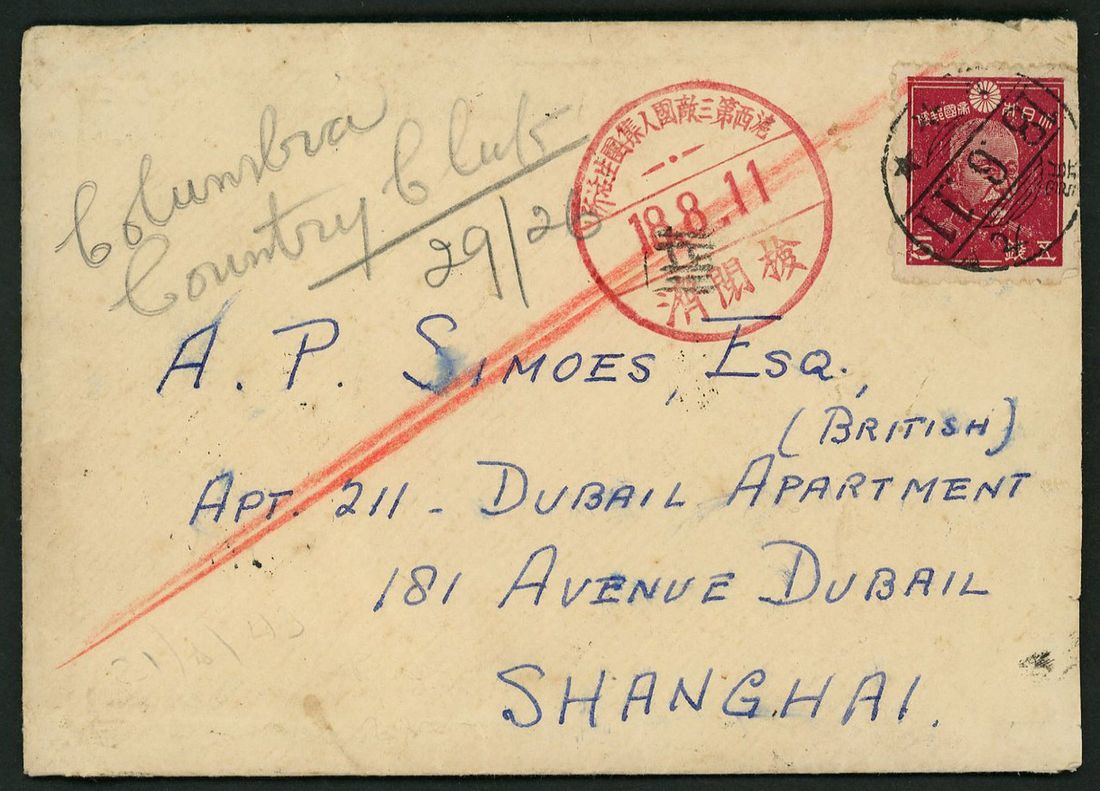 1943 (11 Jun) envelope to Shanghai China bearing Japan 5s tied by 'Kowloon 11 .6.18' with Shanghai arrival and with circullar 'Great Western Road Third Enemy Civilian Assembly Centre/ Censor' in red on face dated '11. 8.18'. Fine.