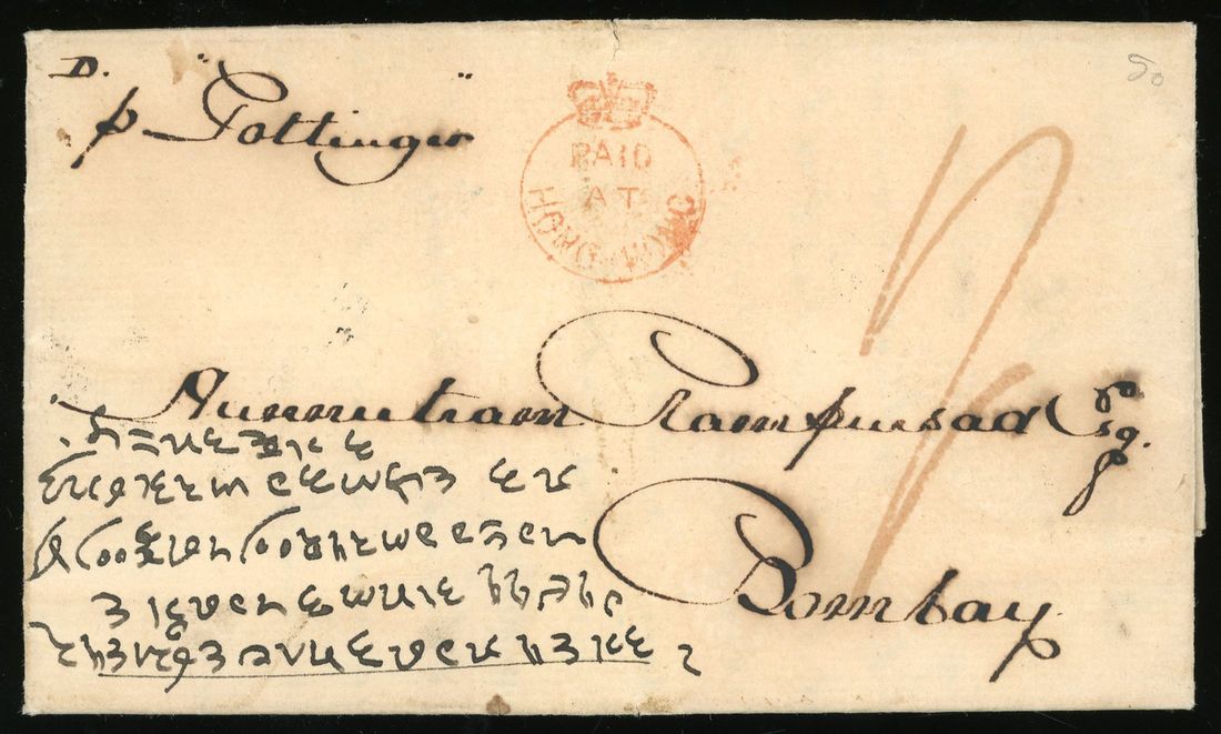 1854 (19 July) entire letter from Jardine & Matheson in Hong Kong to Bombay "(by)'Pottinger'" showing red 'PAID/AT/HONG KONG' crowned-circle handstamp (SG CC3) and manuscript 1/- rating. On reverse Bombay arrival cds (3 September). 2013 BPA certificate included. Photo