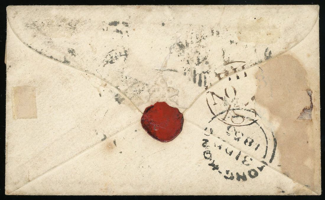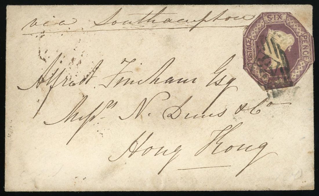 1855 (15 November) incoming cover from England to Hong Kong, via Southampton, bearing QV 6p red violet tied by '23' killer cancel in black. On reverse with Hong Kong arrival (31 December), Webb type 9. Photo