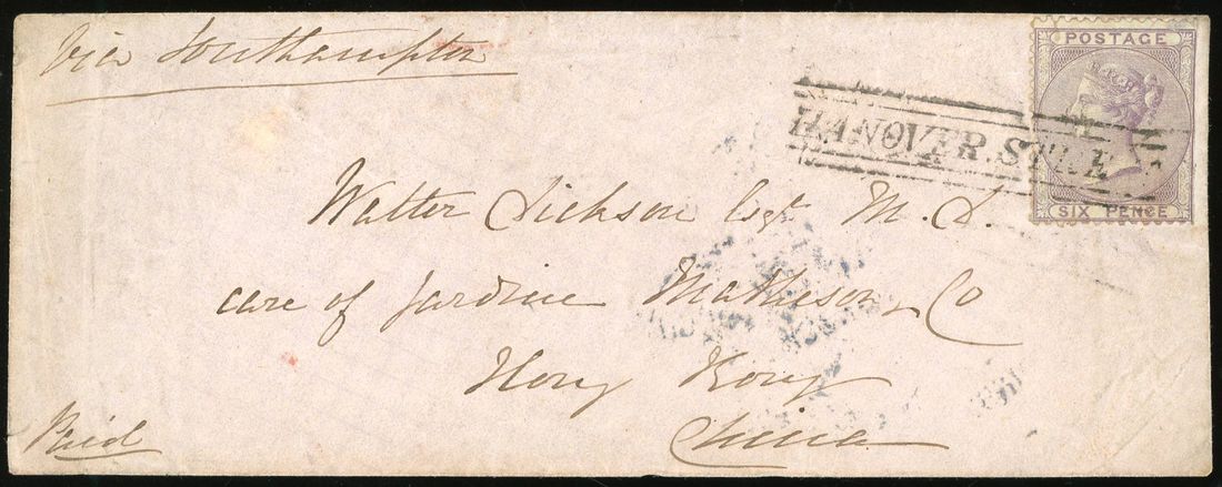 1858 (2 February) incoming cover from Edinburgh to Hong Kong via Southampton bearing QV 6p cancelled by 'HANOVER STREET', on reverse with London transit (3 February), manuscript 'PAID'. Photo