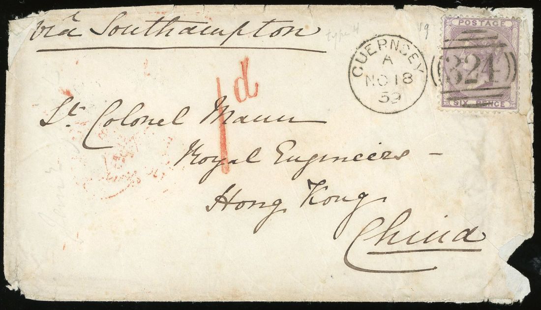 1859 (18 November) incoming cover from Guernsey to Hong Kong bearing 6p. franked with circular '324' alonside Guernsey c.d.s. and "1d" handstamped in red. On reverse London transit (19 November) and Hong Kong arrival (13 January 1860). Photo