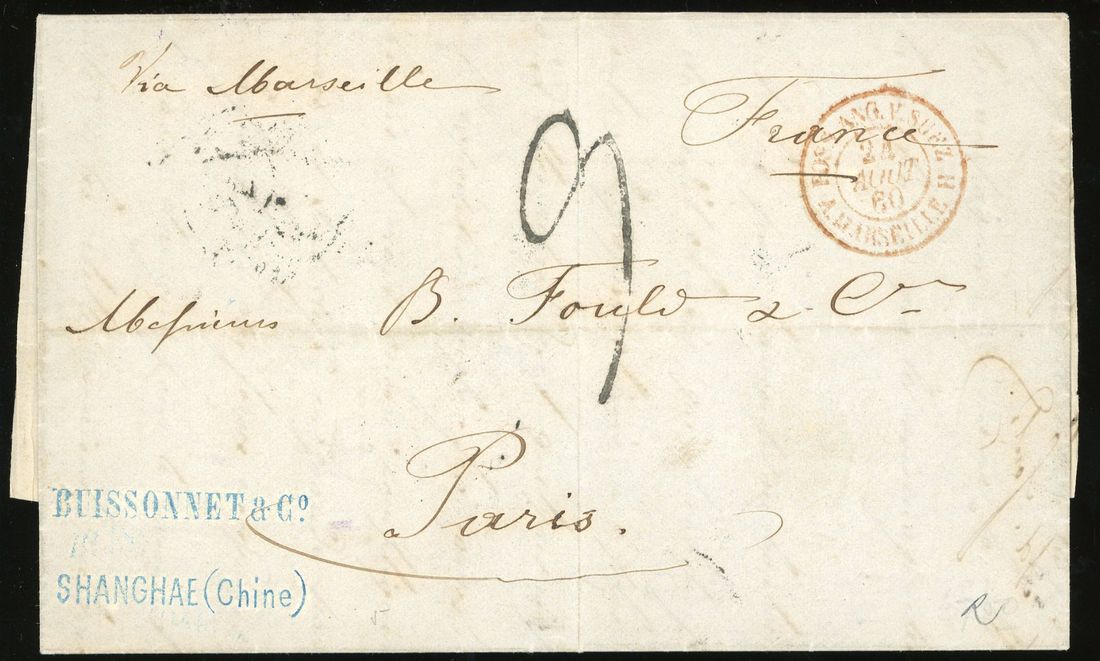 1860 (14 June) entire letter from Hong Kong to Paris via Marseille (24 August), on reverse Paris arrival (25 August) and Hong Kong Webb type 31a. Photo