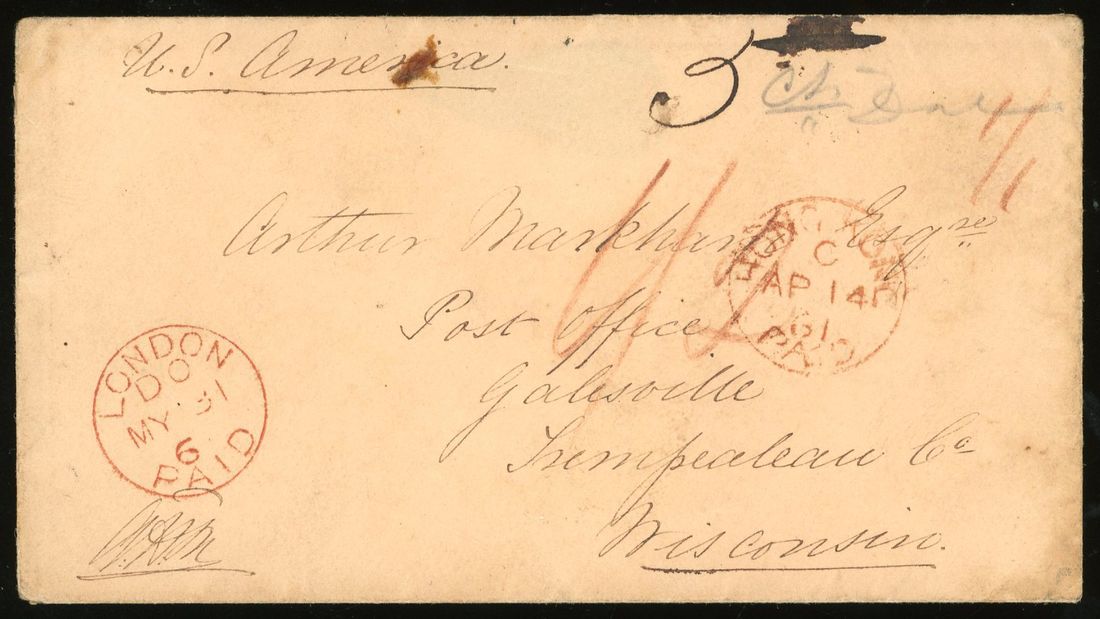 1861 (14 April) cover from Hong Kong to Wisconsin/USA with "HONG KONG/PAID" in red (Webb type 14) and "LONDON/31 MAY/PAID" in red, on reverse additional Hong Kong c.d.s (Webb type 13). Photo