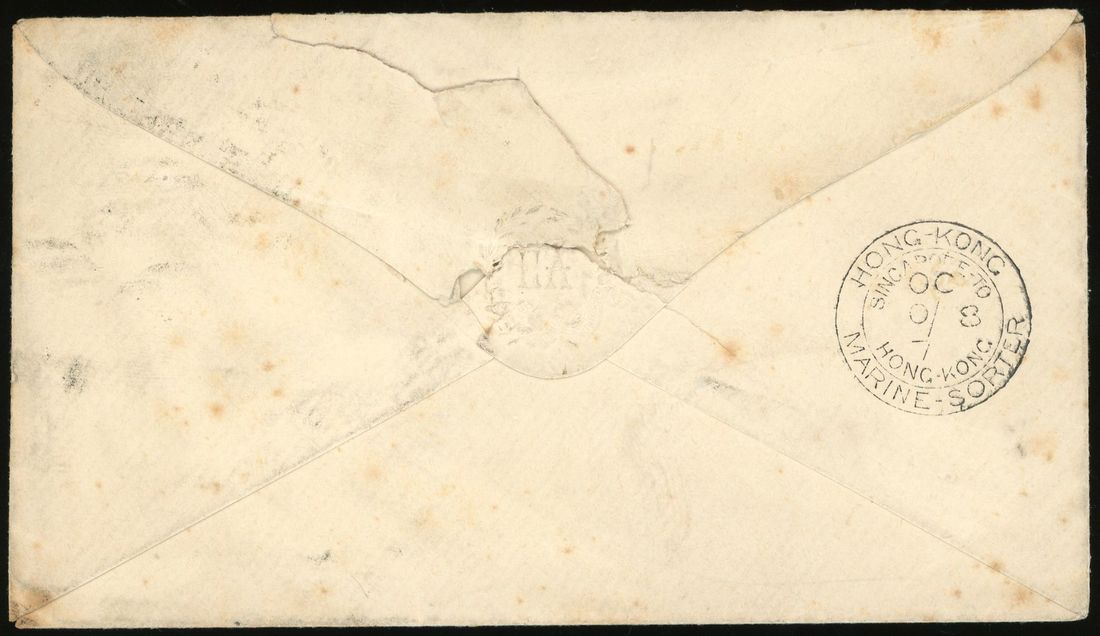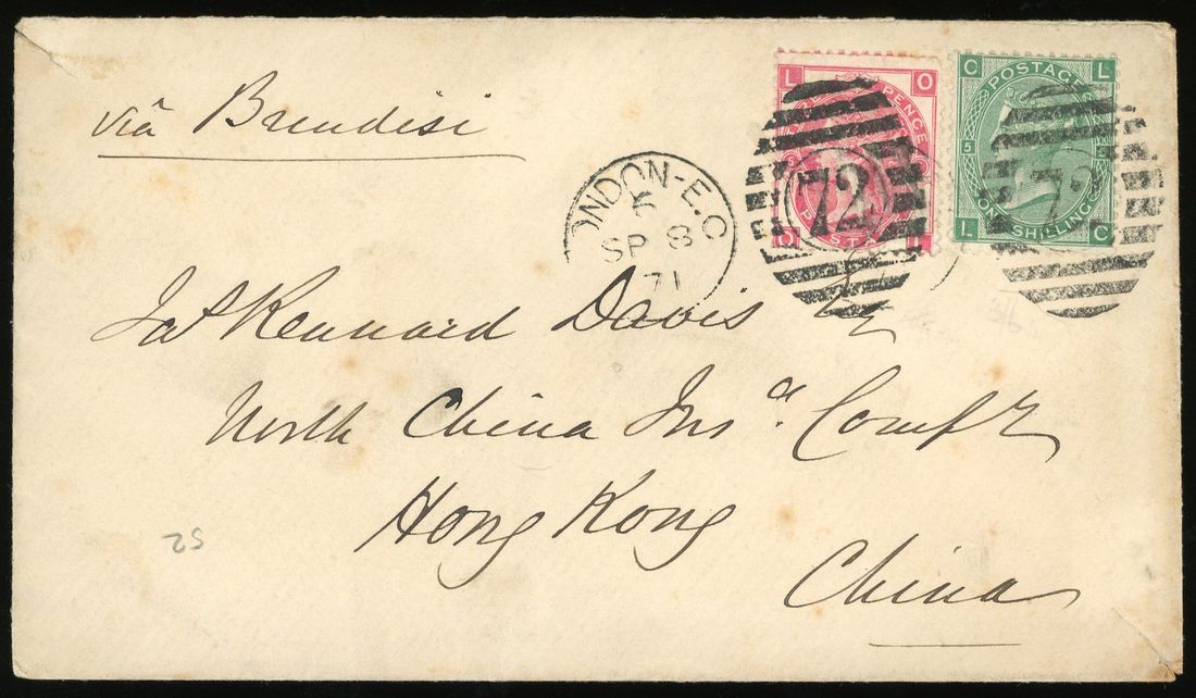 1871 (8 September) incoming cover from London to Hong Kong "via Brindisi" franked with 1s and 3d tied by "72" killer chop alongside London EC dispatch, on reverse 'HONG KONG MARINE SORTER/Singapore to Hong Kong OC 10/18 71" c.d.s., scarce. Photo
