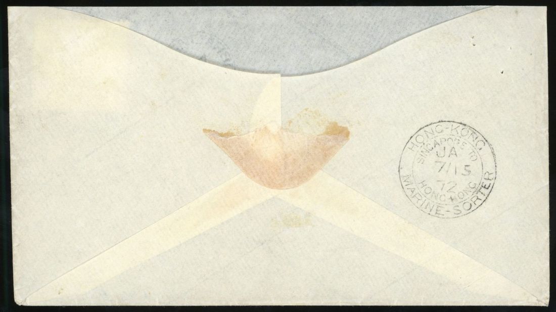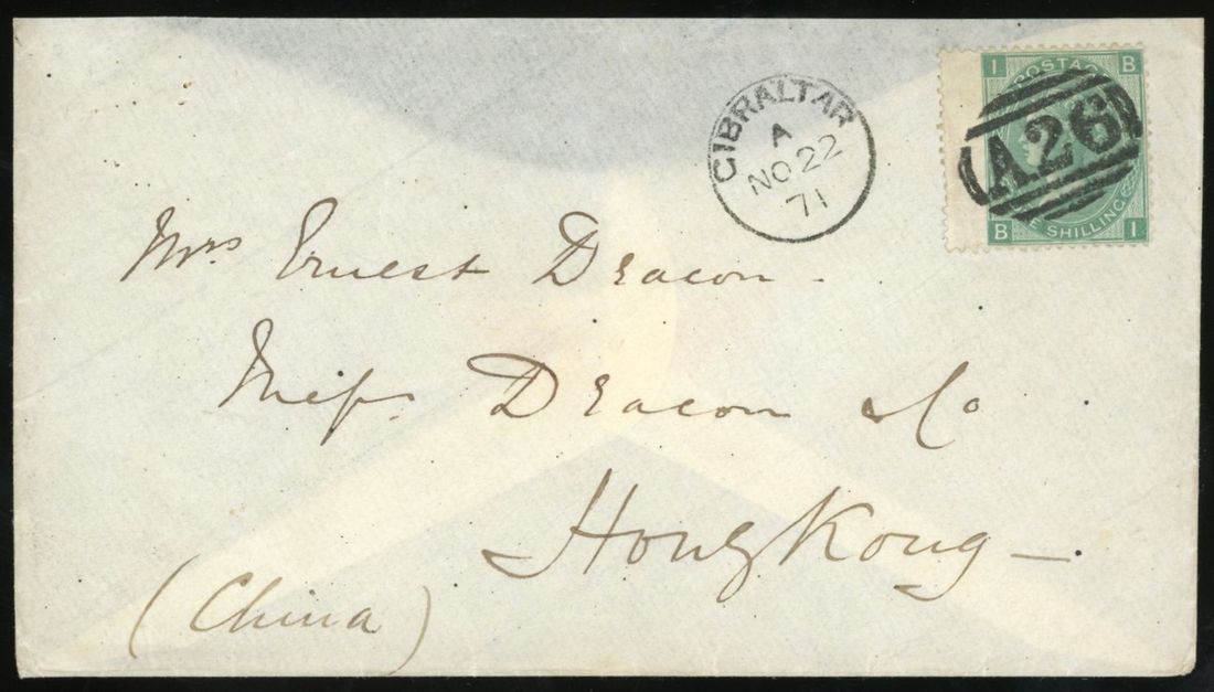 1871 envelope addressed to Hong Kong bearing Great Britain 1s tied by A26 numeral with adjacent Gibraltar dated 'No 22 71' with 'Hong Kong Marine-Sorter Singapore To Hong Kong' on reverse dated '7 Jan 72'.Lovely item of incoming mail to Hong Kong.