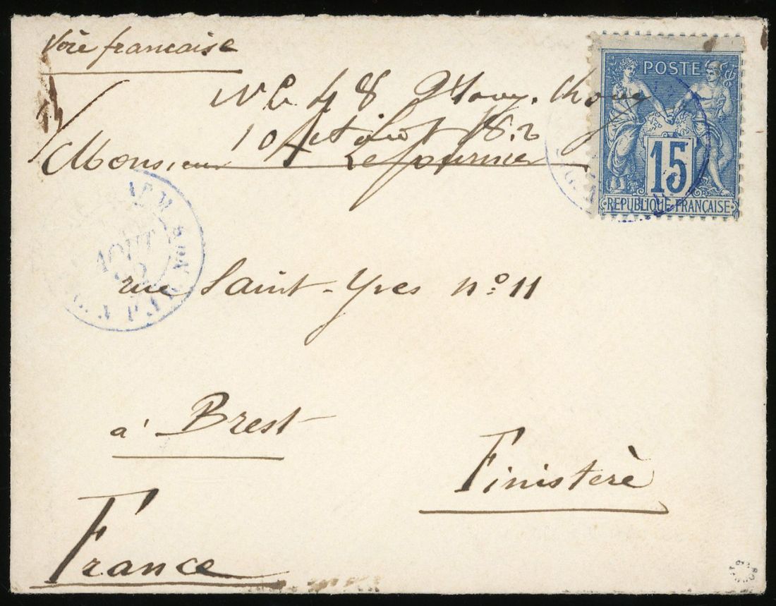 1882 (10 August) cover from a French sailor based in Hong Kong to Brest bearing 15cts tied by 'CORR. D. ARM/LIGNE N P FR No2' in blue (scarce in this colour), on reverse Marseille transit (12 September) and Brest arrival (14 September). Photo