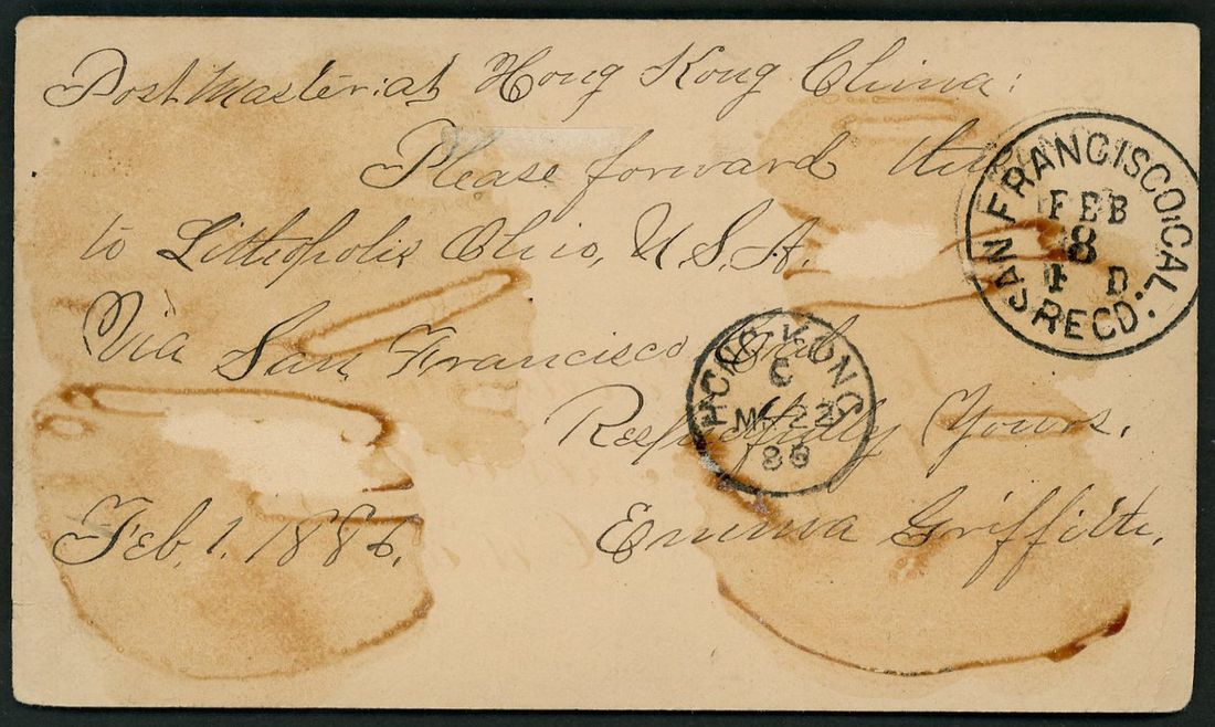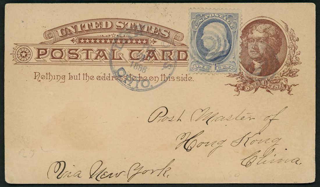 1886 United States postal stationery card one cent upgraded with 1c tied by concentric ring with adjacentOhio c.d.s. addressed to Hong Kong with 'San Francisco' transit and Hong Kong arrival.Fine.