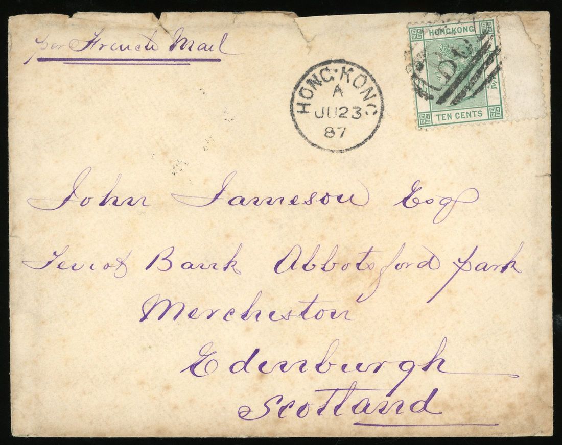 1887 (23 June) cover from Hong Kong to Scotland bearing QV 10cts tied by "B62" killer chop with Hong Kong despatch alongside, on reverse Edinburgh arrival (27 July). late usage of the killer cancel after discontinuation in 1885. Photo