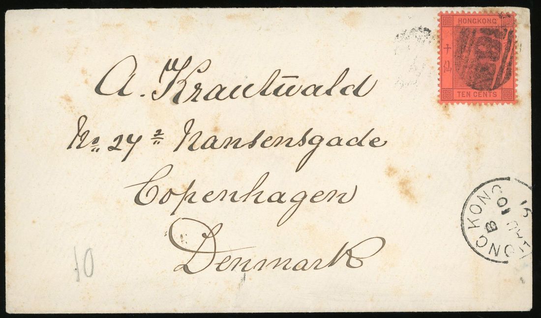1891 (10 August) cover from Hong Kong to Denmark bearing QV 10cts tied by "B62" killer cancel (late usage) with Hong Kong despatch, on reverse Oslo arrival (14 September). Photo