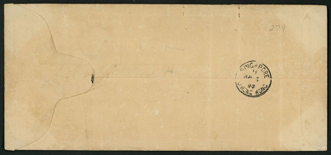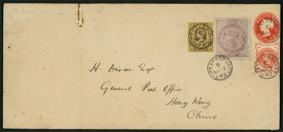 1893 Great Britain postal stationery envelope half pence upgraded with 1/2d,3d and mixed with Revenue 1d tied by 'Bury St. Edmonds Mr 9 93' c.d.s. to Hong Kong routed via Singapore. Very attractive franking paying the 5 pence rate.Fine.