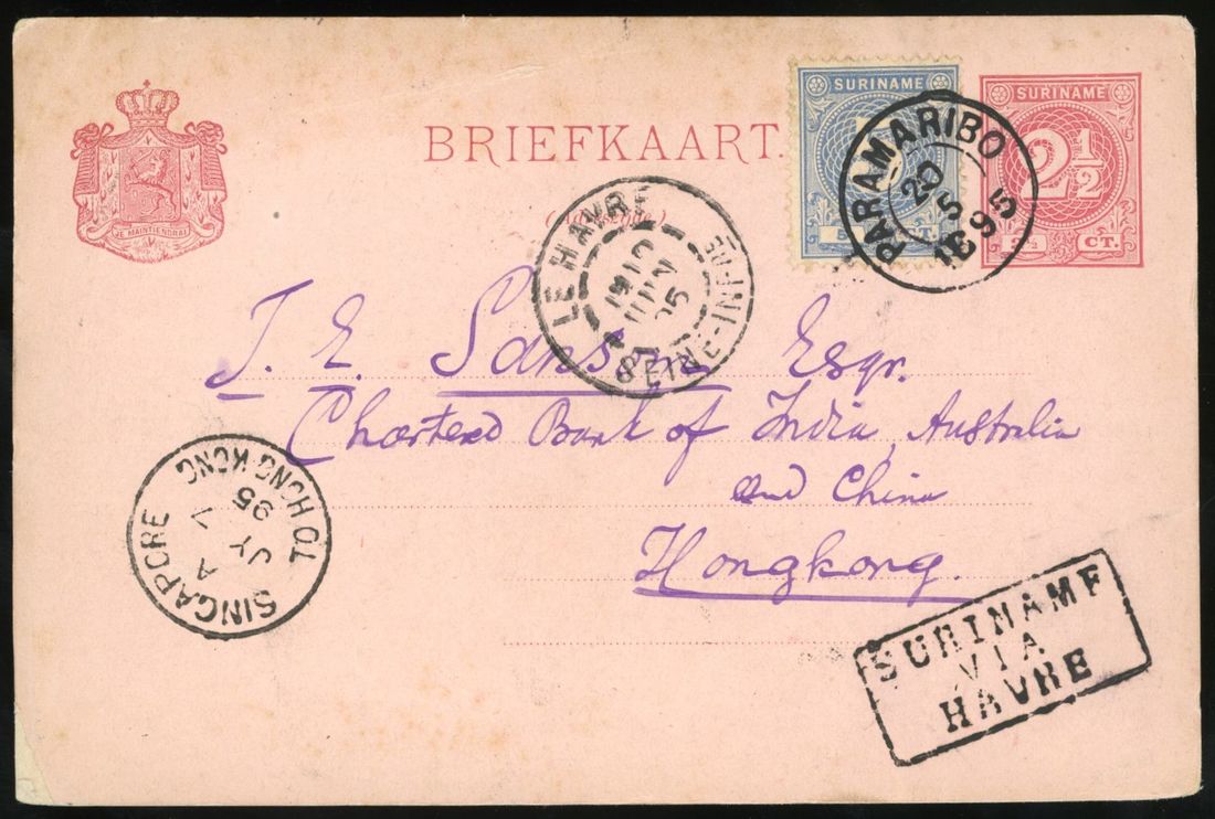 1895 (20 May) postal stationery card 2 1/2ct upgraded with 5c tied by 'Paramaribo'c.d.s. to Hong Kong routed via France with marine sorter 'Singapore to Hong Kong A' dated 'JY 7' sent on the steamer 'Kaisar-I-Hand'.Very fine item of maritime mail of Hong Kong.