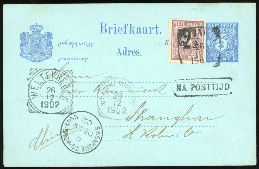 1902 (26 Dec) Netherland Indies postal stationery card 5c upgraded with 2 1/2 on 3c tied by Batavia squared circle with boxed 'Na Posttijd' addressed to Shanghai, routed via Weltevreden and Dutch Post Office Singapore with 'N.I.Agent/Singapore 29 12 1902' and 'Singapore to Hong Kong C DE 29 02.'Very Fine.
