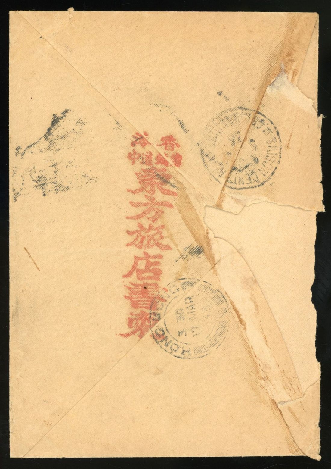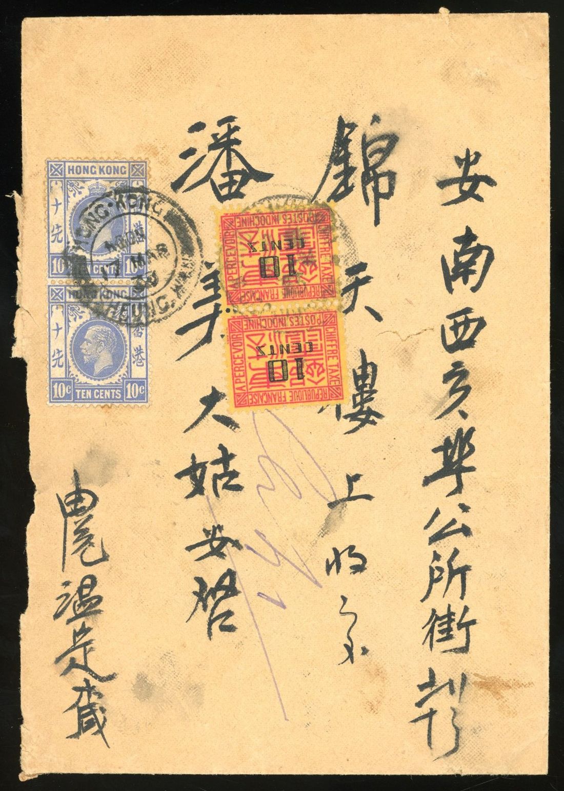 1933 (17 Mar) envelope to Saigon bearing KGV 10c in pair tied by 'Hong Kong Sheung Wan' c.d.s. underpaid and bearing French Indo-China postage dues 10c in pair tied by Saigon Central Cochinchine receiver. Lovely item of underpaid mail from Sheung Wan Branch Office to French Indo-China.