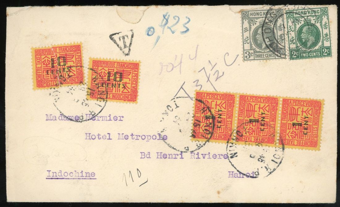 1934 (26 May) envelope to Hanoi,French Indo-China bearing KGV 2c and 3c tied by 'Hong Kong' c.d.s. underpaid with 'T' hand-stamp and bearing French Indo-China postage dues 1c x3 and 10c x2 tied by 'Hanoi Tonkin' receiver.A rare item of postage due mail from Hong Kong to French Indo-China.