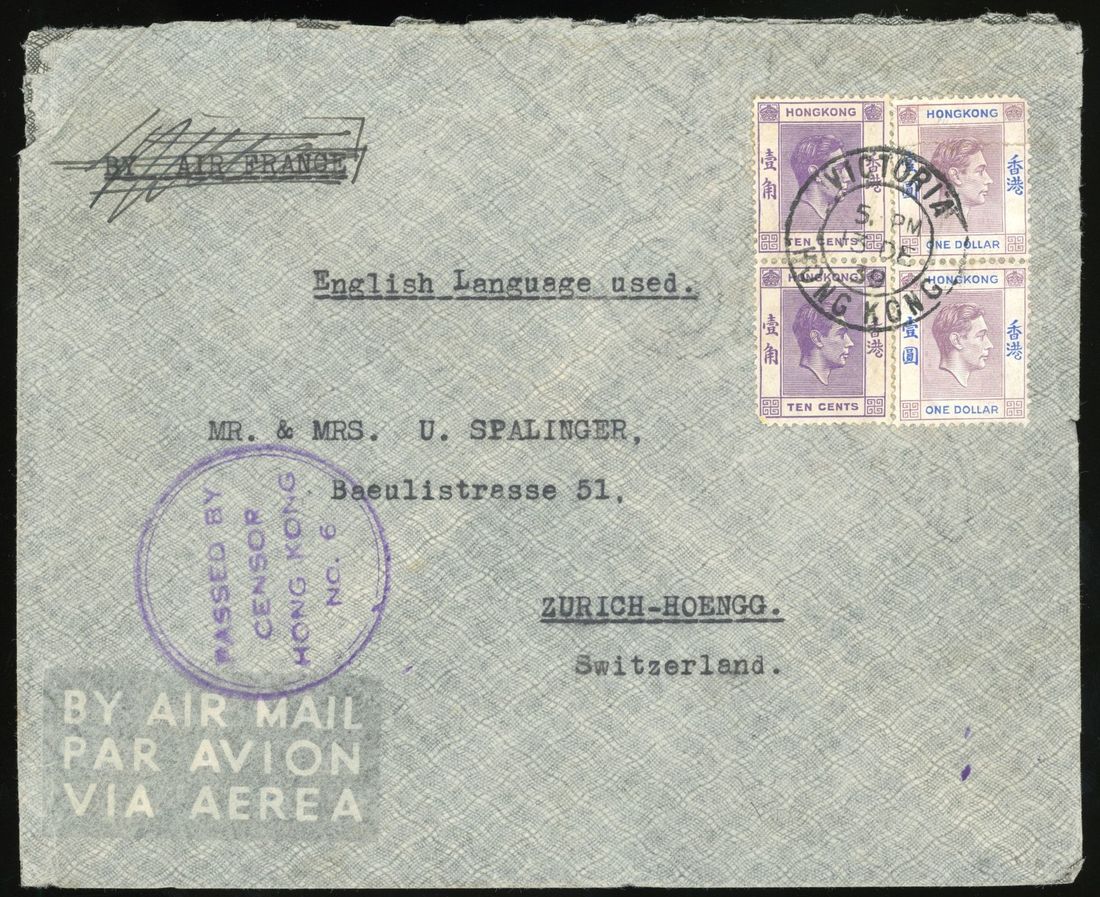 1939 (13 Dec) air mail envelope to Switzerland bearing KGVI 10c x2, $1 x2 tied by 'Victoria Hong Kong' c.d.s. with circular 'Passed By Censor Hong Kong No.6' in voilet on face. Fine.