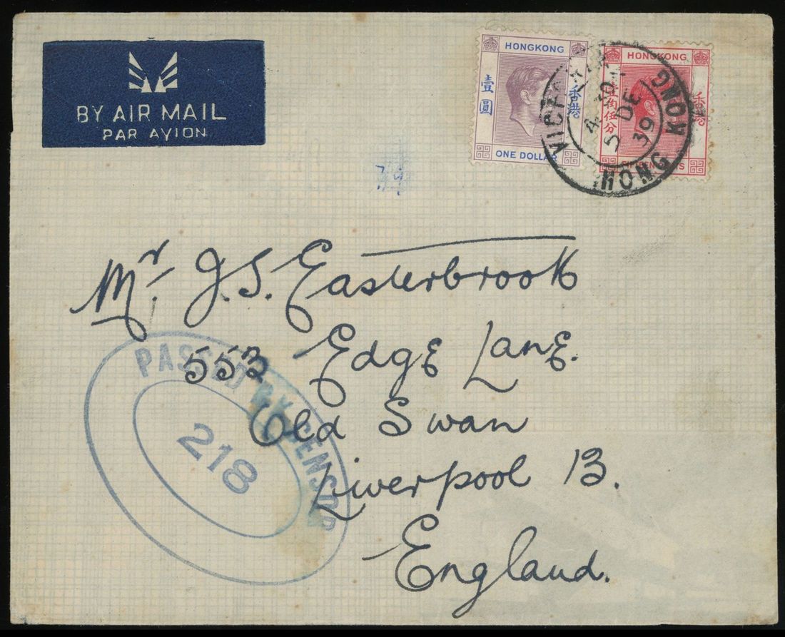1939 (5 Dec) air mail envelope to England bearing KGVI 15c and $1 tied by 'Victoria Hong Kong' c.d.s. with oval 'Passes by Censor 218' hand-stamp in blue on face .Fine.