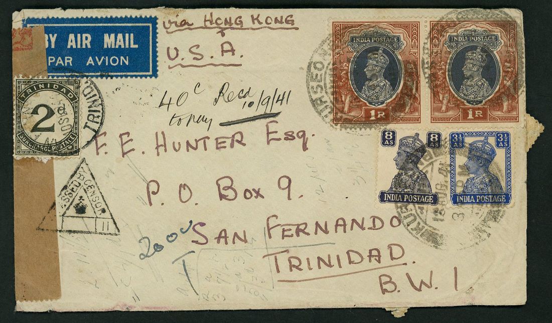 1941 (18 Aug.) Air mail from India via Hong Kong to Trinidad. Bearing India 1r grey and brown (2), 3½a bright blue and 8a slate tied by Kurseong double ring with "Opened By Censor" tape by trangular "Passed By Censor/ C11" on face, underpaid endored "40c/ To Pay" and bearing Trinidad postage due 2d blavk (block of 6) tied by San Fernando/ Trinidad arrival (10-9-41), Superd item.
