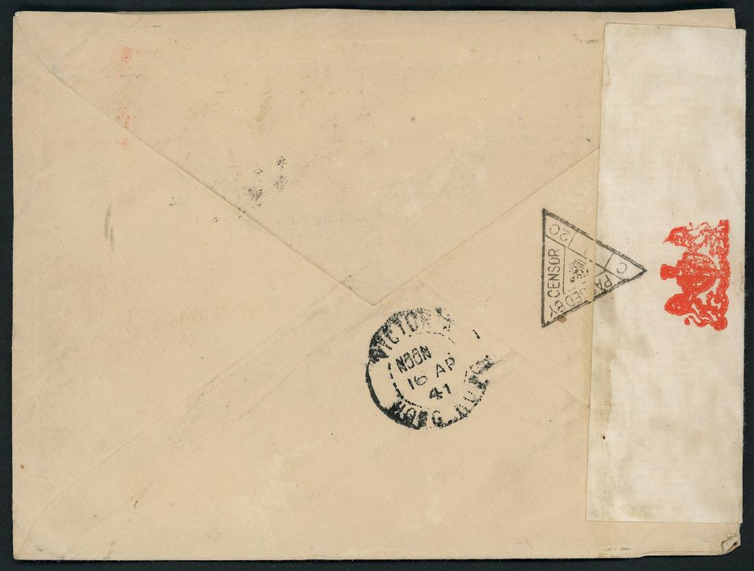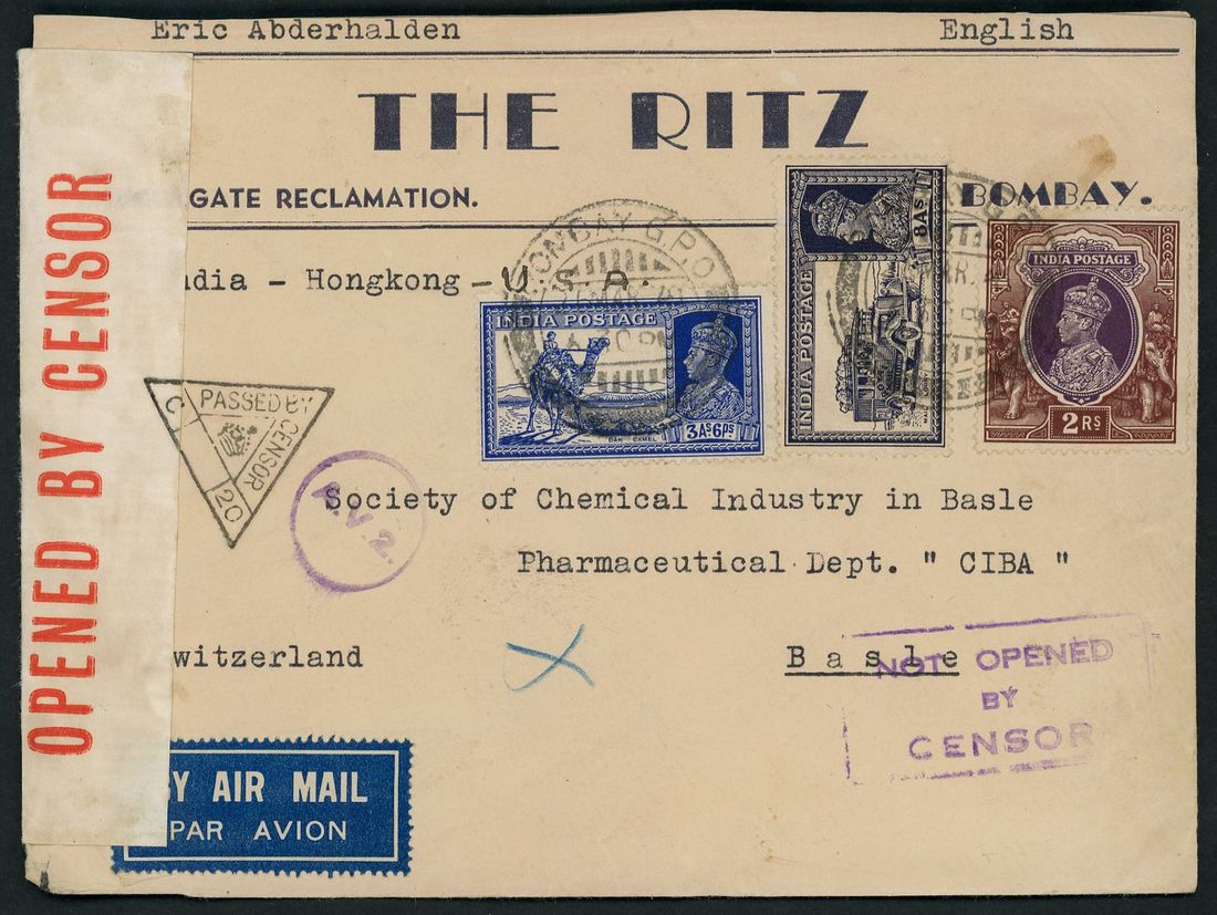 1941 air mail cover written from Bombay to Switzerland bearing India 3a.8a. and 2r tied by Bombay double ring with 'Passed by Censor C20' cachet and 'Opened by Censor' label sent air mail via Victoria Hong Kong with boxed 'Not Opened by Censor' cachet in violet and circular 'A.V.2.' hand-stamp.