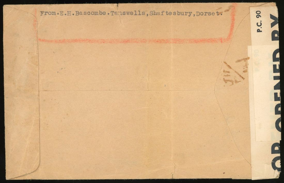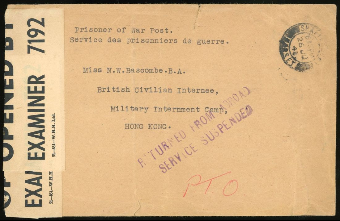 1945 (26 Ju) stampless envelope written from Dorset headed 'Prisoner of War Post. Service des prisonniers de guerre.' addressed to 'Military Internment Camp,Hong KOng'. cancelled 'Shaftesbury/Dorset 26 Ju 45'c.d.s. with 'Opened by Examiner 7192' label and hand-struck instructional 'Returned From Abroad Service Suspended' in violet on face.Rare item of mail into Stanley Internment Camp but never received.