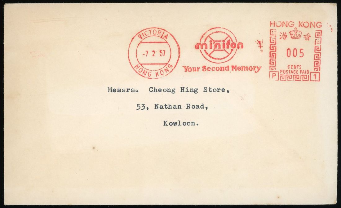 1957(7 Feb) local mail bearing special framed 5c postage paid in red and cancelled "Victoria Hong Kong" in red.Fine.