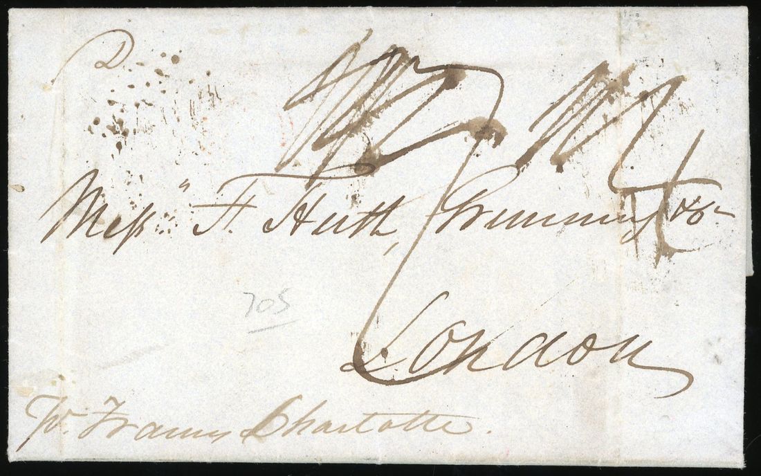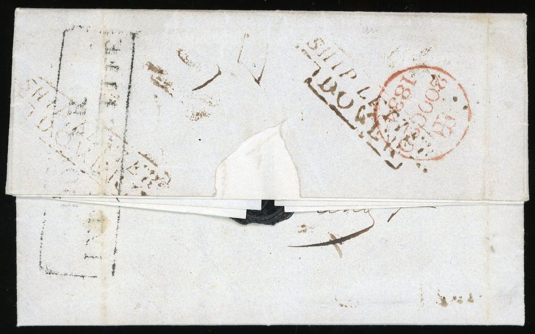 1834 (24 April) entire letter from Canton to Fred Huth & Co. in London (20 October) "(by) 'Francis Charlotte'" showing incorrect "India Letter/Dover" framed handstamp in black annulled by "Ship Letter/Dover" in black. An extremely rare example of an entire from Canton incorrectly marked as an India Letter caught by an astute Ship Letter Office clerk in London who corrected with a Ship Letter handstamp.Very clear arrival cancel. Photo