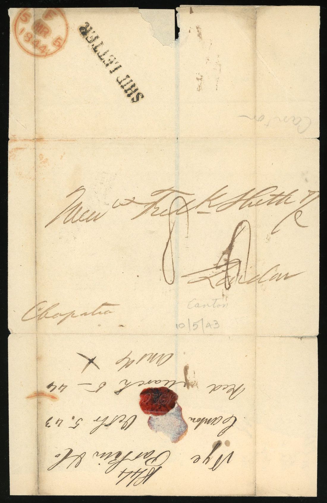 1843 (5 October) entire letter from Nye Parkin & Co. to London (5 March 1844) "(by) 'Cleopatre'" with 'Ship Letter' handstamped and Arrival c.d.s. on reverse, rated 8d, fine. Photo