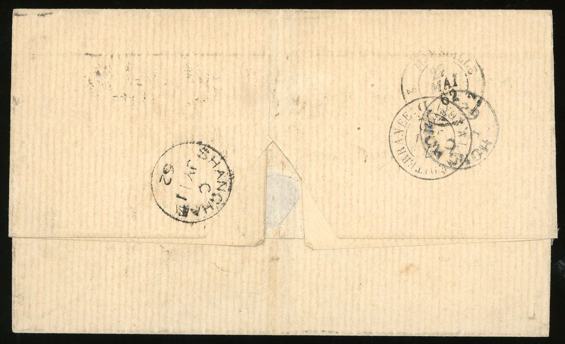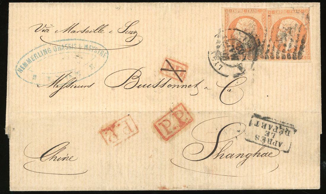 1862 (20 May) entire letter from Lyon to Shanghai "via Marseille and Suez" franked with two Napoleon 40cts with red "P.D" hand stamp crossed out and replaced by "P.P" hand stamp, black "APRES LE DEPART", on reverse "LYON A LA MEDITERRANEE/27 May", "MARSEILLE/27 May", Hong Kong transit (7 July) Webb type 13 and British Post Office "SHANGHAE/11 July/62" arrival c.d.s.. Photo