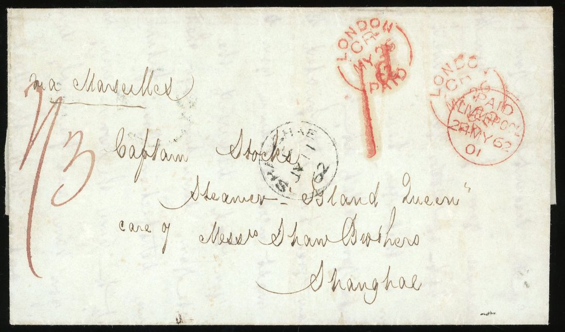 1862 (24 May) entire letter from Liverpool to Shanghai "via Marseille", transit by London with red circular 'PAID/26 May/62' c.d.s., 'SHANGHAE/11 July/62' arrival c.d.s. and manuscript '1/3' rate, on reverse Hong Kong transit (7 July). Photo