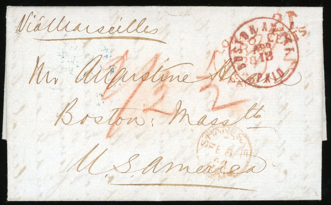 1864 (6 February) entire letter from Shanghai to Boston, Augustine Heard correspondence, "via Marseille", manuscript rate "2/2 1/2", "21 cents" handstamp with numeral "1" of "21" reversed variety, Boston arrival (13 April), on reverse Shanghae index C and Hong Kong index C transit, both in black. Ex Mong collection. Photo