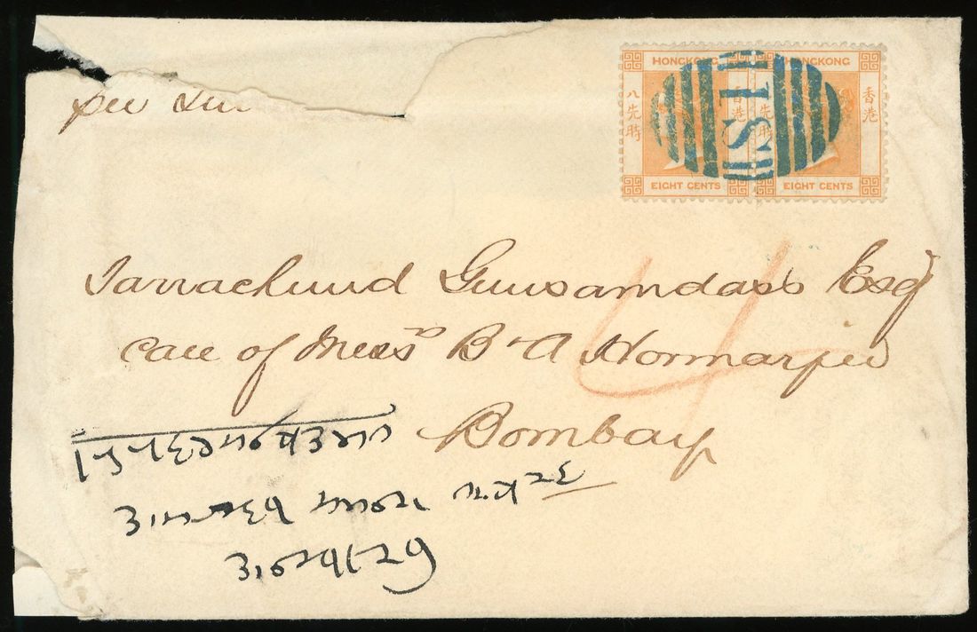 1870 (25 August) cover from Shanghai to Bombay bearing Hong Kong QV 8cts pair tied by "S1" chop, on reverse Shanghae A Index and Hong Kong C Index (30 August) c.d.s., damaged at top. Letter included from an opium distributor requesting a price cut from his supplier. Photo