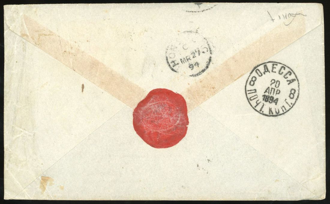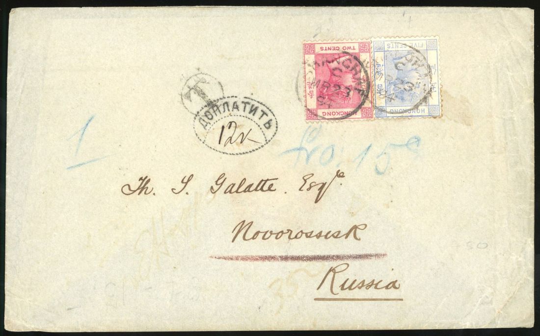 1894 (23 Mar) envelope to Russia bearing QV 2c and 5c tied by 'Shanghai' c.d.s. routed via Hong Kong dated 'Mr 27', underpaid with Hong Kong circular 'T' hand-stamp with oval Russian tax hand-stamp on face and Odessa receiver on reverse.Very fine.