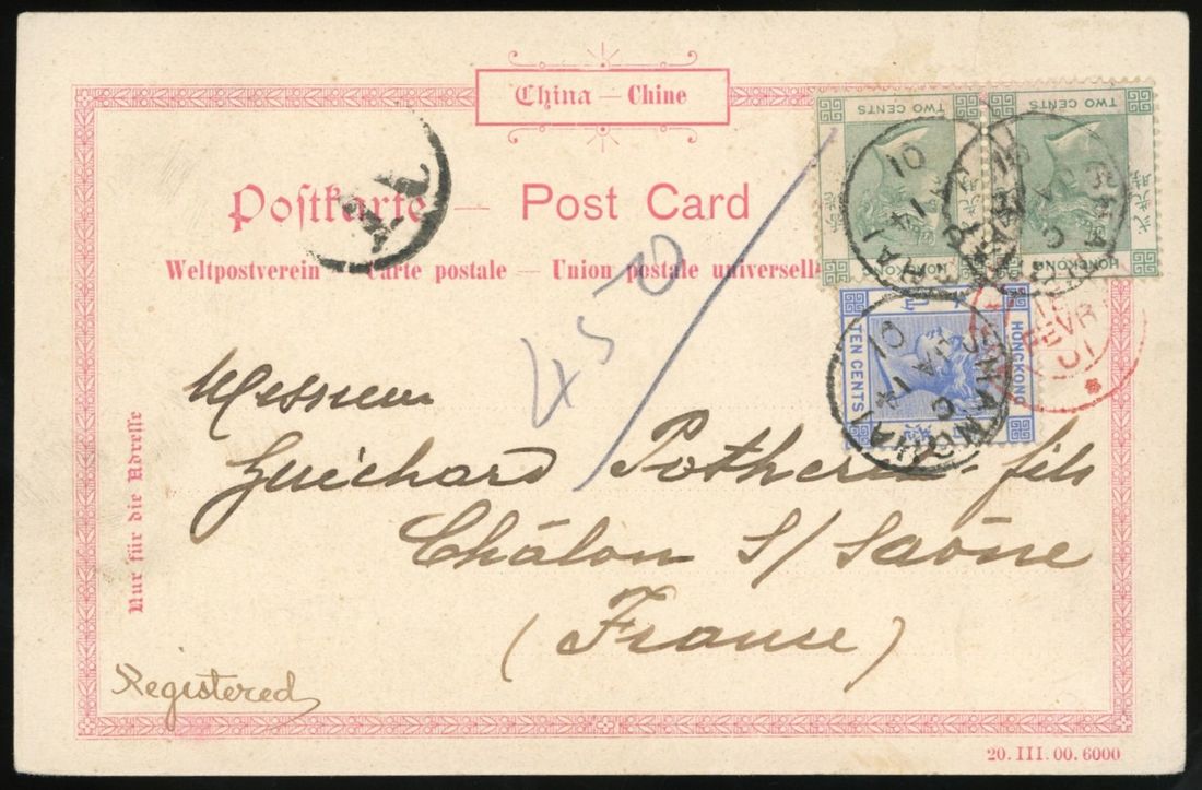 1901 (14 Jan) registered picture postcard to France bearing Hong Kong QV 2c in pair and 10c tied by 'Shanghai' c.d.s.with circular hand-struck 'R' with French entry cachet in red.Very scarce registered postcard from Shanghai paying 4 cent postcard rate plus 10 cent registration fee.Fine.