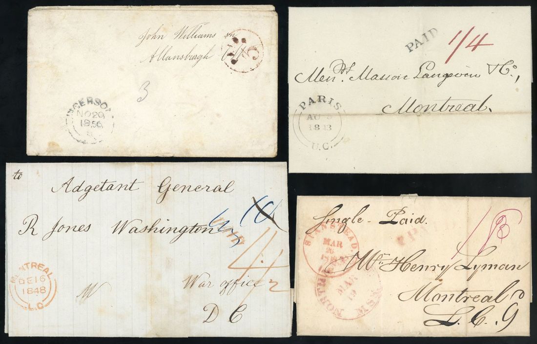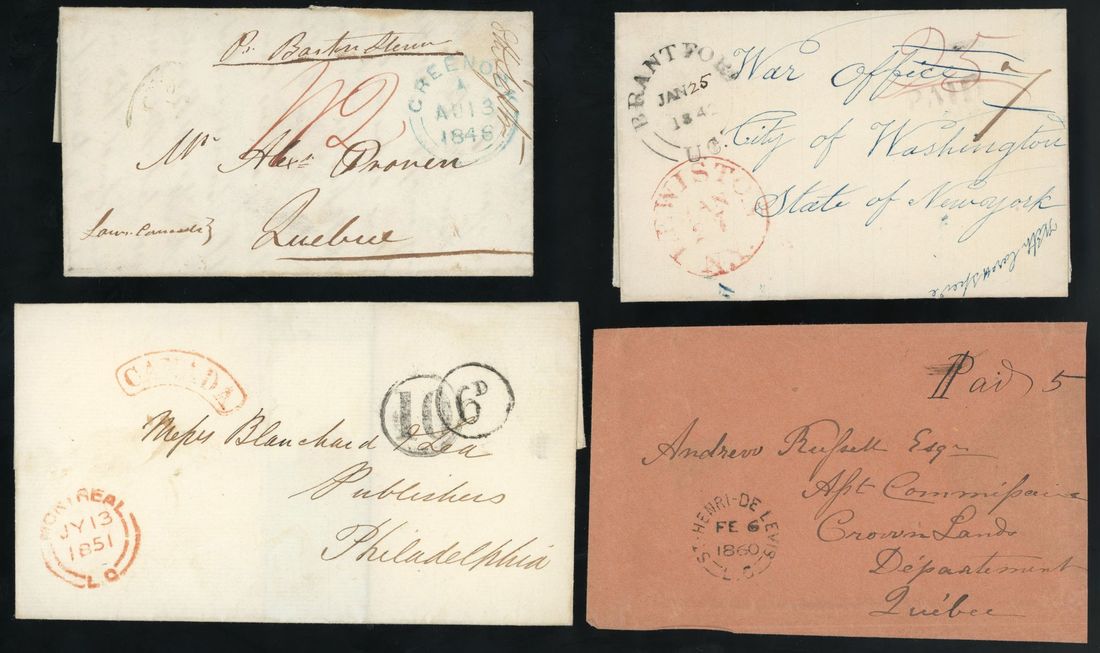 Canada : @840-95 selection of twenty-two entire letters, attractive assortment offering a nice mix of origin postmarks, auxiliary markings, rates and destinations (both domestic and cross-border to the U.S.A.), note three to the War Office, a money letter from Hamilton CW to Brentford, plus times for Quebec, Nova Scotia and New Brunswick, generally sound, very fine.