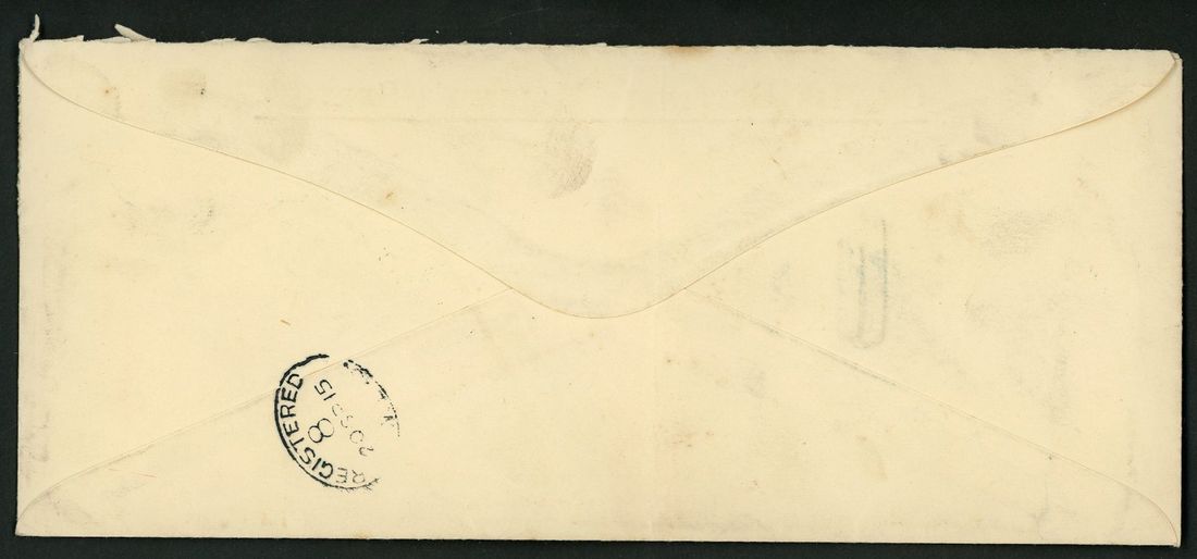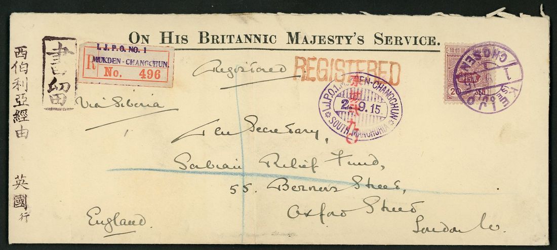 1915 registered mail envelope to London bearing Japan 20s tied by 'Keijo (Seoul) Chosen date stamp in violet '1 Sep15' routed via Manchuria railway with oval 'I.J.P.O. Mukden-Changchun/ South Manchuria' in violet dated '2.9.15.' with Provisional registration label 'I.J.P.O. No.1 Mukden-Changchun and London receiver applied on reverse 20 Sep.15. Registered mail via the Manchuria railway is extremely scarce.Fine.