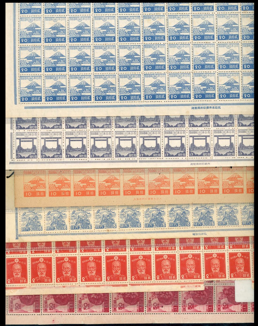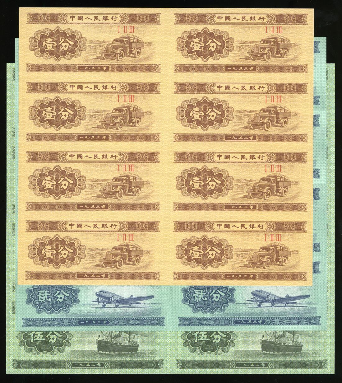 1937-47 six complete sheets or large blocks of mints issues in mixed condition.With addition The People's Bank of China 1953 RMB 1,2,5Fen uncut sheets of 8.Fine