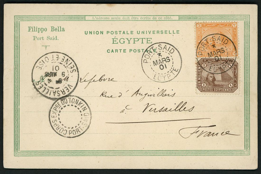 1901 (3 Mar.) Picture Postcard to France, bearing Egypt 1m brown and 3m orange yellow , tied by French Post Office "Port Said" double ring "3rd Mars o1" with adjacent undated circle "Corps Expre du Tonkin/ Port Said" and Versailles arrival "9th Mars" on face. very attractive item from the Boxers in Egypt in transit the Campaign.