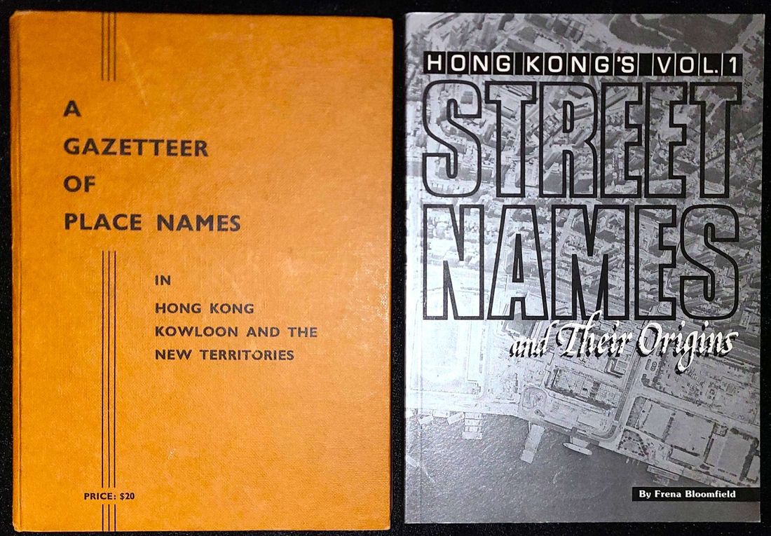 1969年版 "A Gazetteer of Place Names/ in Hong Kong , Kowloon and The New Territories" , 附有香港地圖三幅, 精裝本. 香港政府印刷, 英文加少量中文; 另有1984年版 "Street Names and Their Origins/ Hong Kong'd Vol. 1" 作者: Frena Bloomfield, 香港市政局出版, 內有大量香港街景圖片, 平裝本英文書.