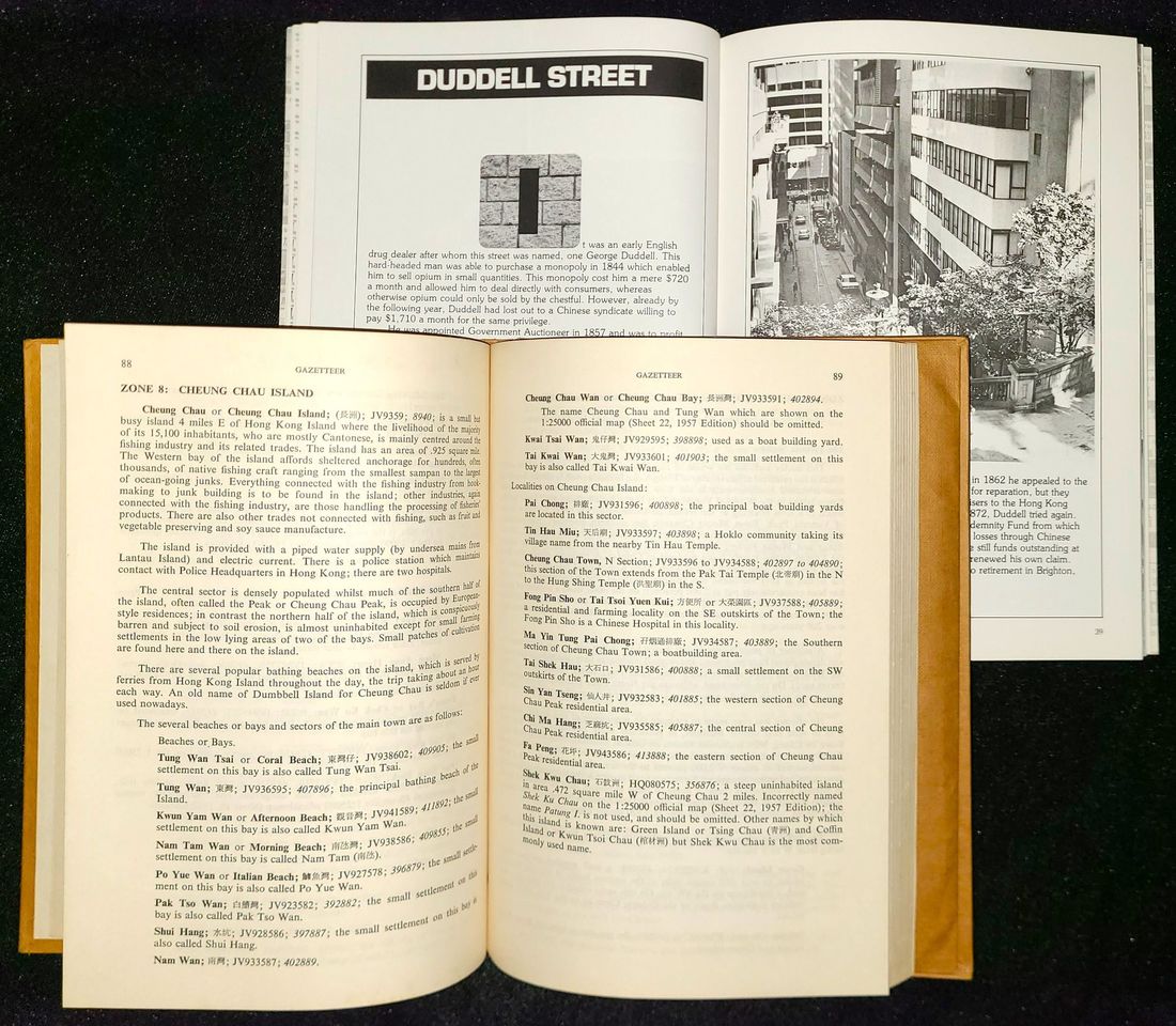 1969 "A Gazetteer of Place Names/ in Hong Kong, Kowloon and The New Territories" is a hardcover book with three sheets of Hong Kong's map. It is printed by the Hong Kong government and is in English with a small amount of Chinese. Another 1984 edition, "Street Names and Their Origins/ Hong Kong'd Vol. 1," by Frena Bloomfield, is published by the Urban Council of Hong Kong and contains numerous Hong Kong street scene images. It is also in English and is a paperback.