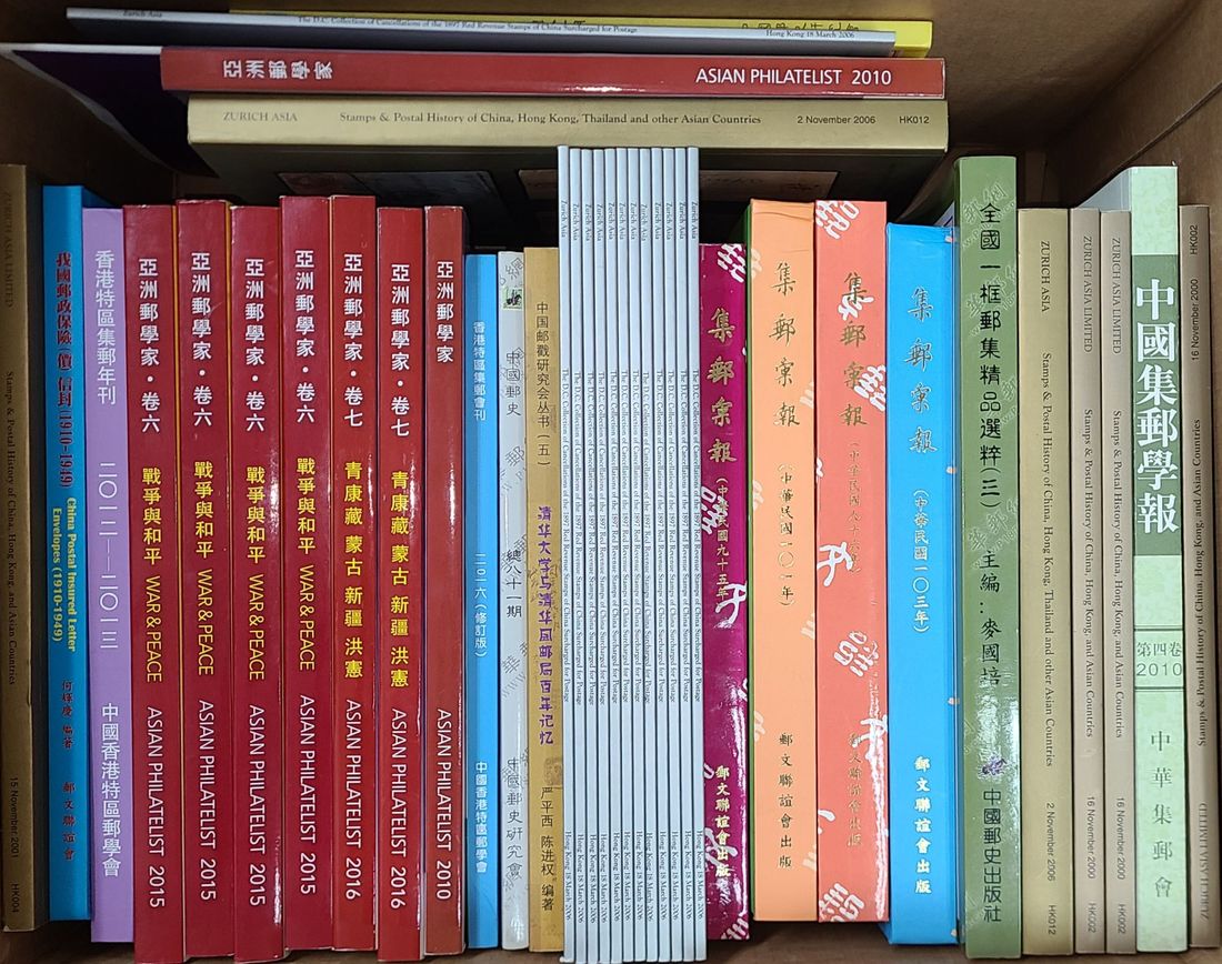 A cartoon box of auction catalogues and philatelic books.