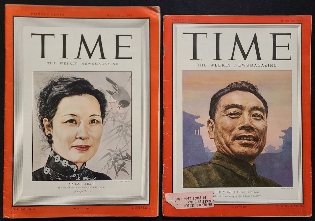 1943 (1 March) and 1951 (18 June) One copy each of Time magazine with Chiang Kai-shek and Zhou Enlai on the cover. In good condition.
