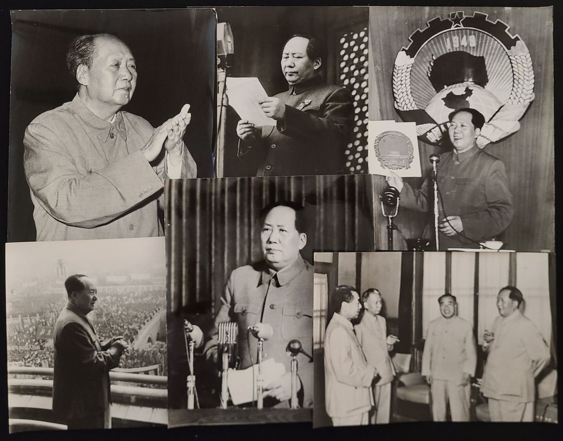 1949-1960年代毛澤東主席不同時期大型照片六枚, 包括: 開國大典, 主持討論國徽圖案, 與周恩來, 朱德及劉少奇合照, 天安門上會見群眾等, 尺寸每幅不同, 約25 x 30cm