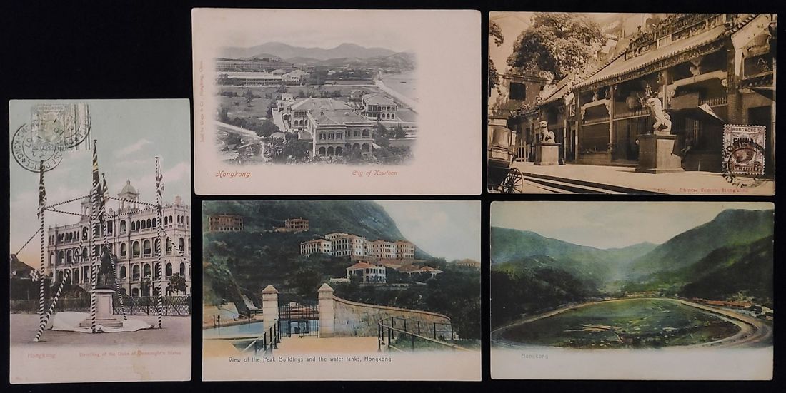 1900-1920年代香港明片五枚; 景物包括上環文武廟, 1900年代尖沙咀金馬倫道一带, 快活谷黃泥涌村, 中環干諾公爵銅像揭幕等等.