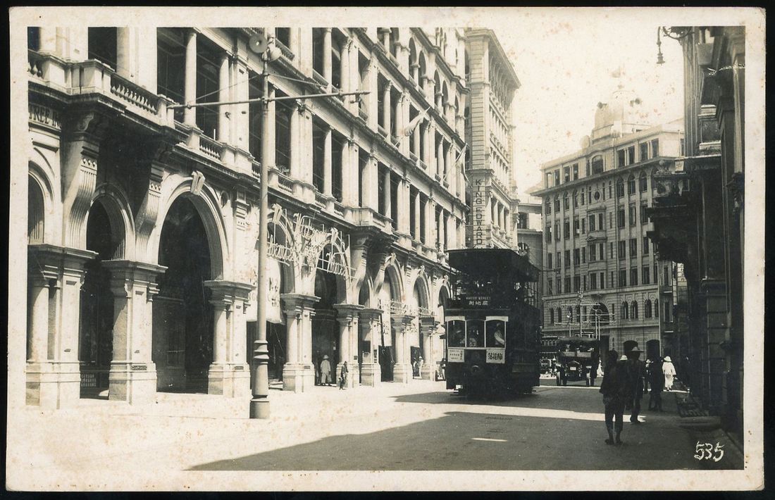 1920年代香港中區德輔道中及遮打道交界照片版明信片, 片中可見行駛中的第三代電車, 左邊是英皇酒店及亞歷山大行, 遠處是廣東銀行大廈.