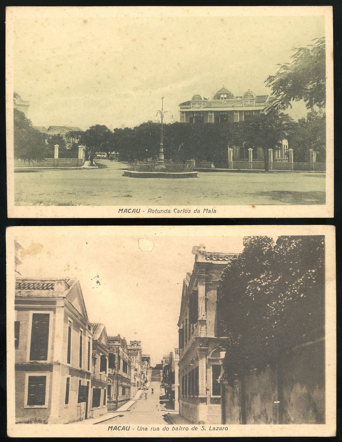 1910s-1920s two postcards of Macau street scenes; one showing the streets near St. Lazarus Church (sent in 1926) and the other showing the Three Lignts (Carlos da Maia). The central circular brick platform is intact.
