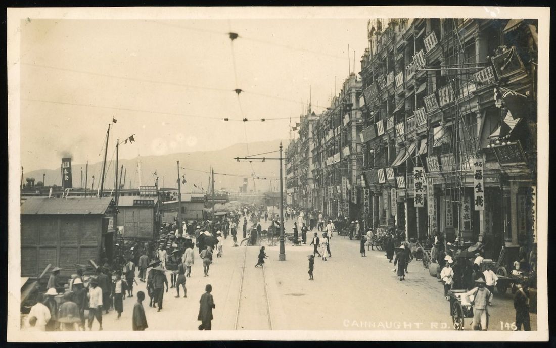 1920s 1930s a real photo postcard of the Hau Tak Pier on Connaught Road Central in Sheung Wan, Hong Kong (near Cleverly Street). The Wing On Ferry is moored at the pier on the left. Close to the pier, many inns can be seen operating on the right.