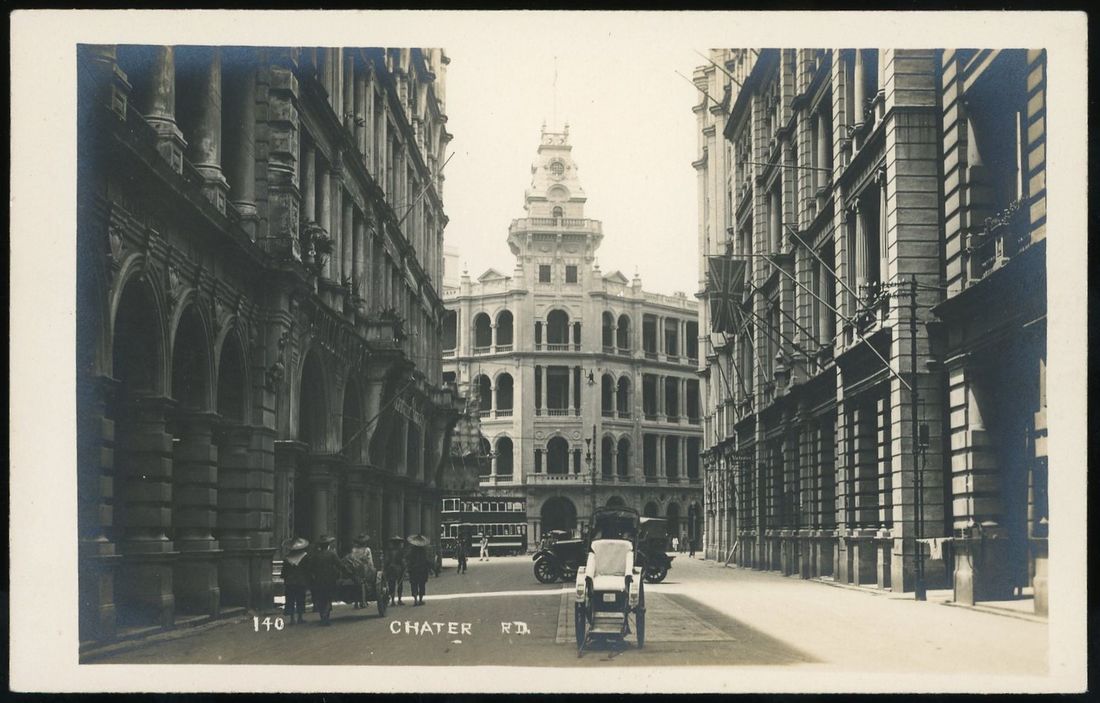 1920s a real photo postcard of Chater Road in Central Hong Kong. The building in the center distance is the second-generation Jardine Matheson Building, with the Emperor Hotel and Alexander House to the left, and St. George's Building and Yu Yan Building to the right.