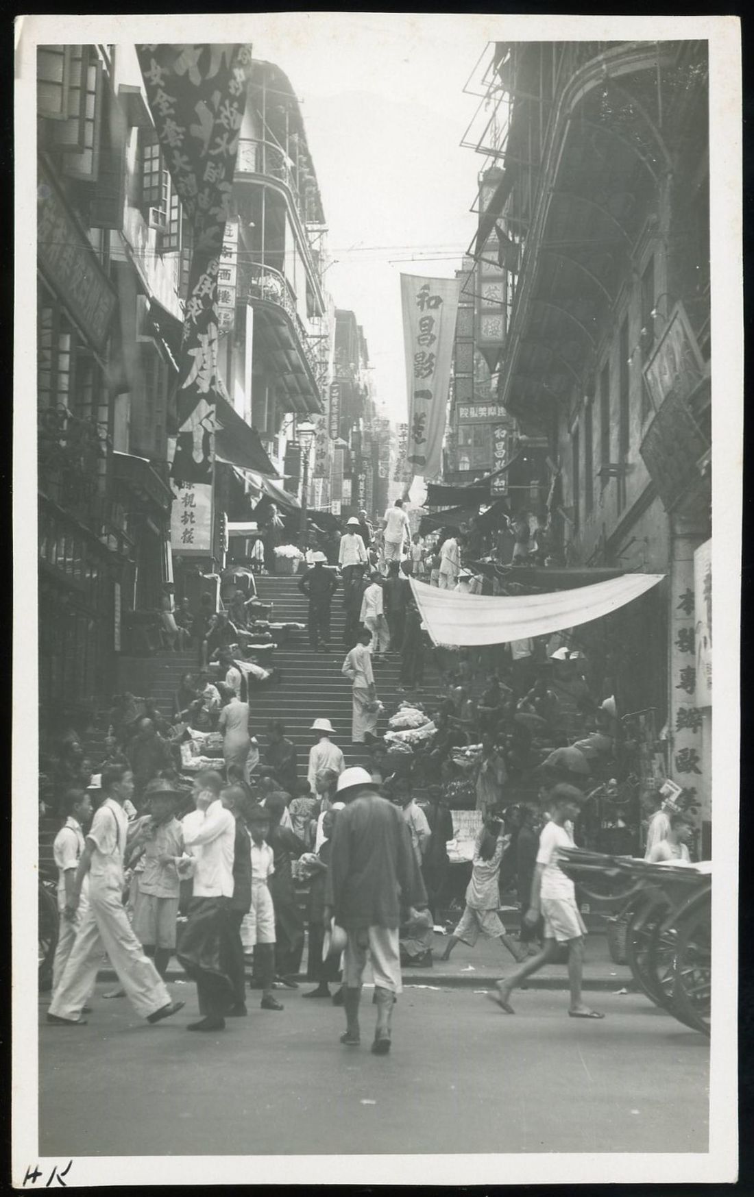 1930s a real photo postcard of Apeardian Street in Central, Hong Kong, showing the Koon Nam Restaurant and Wo Cheong photo Studio.