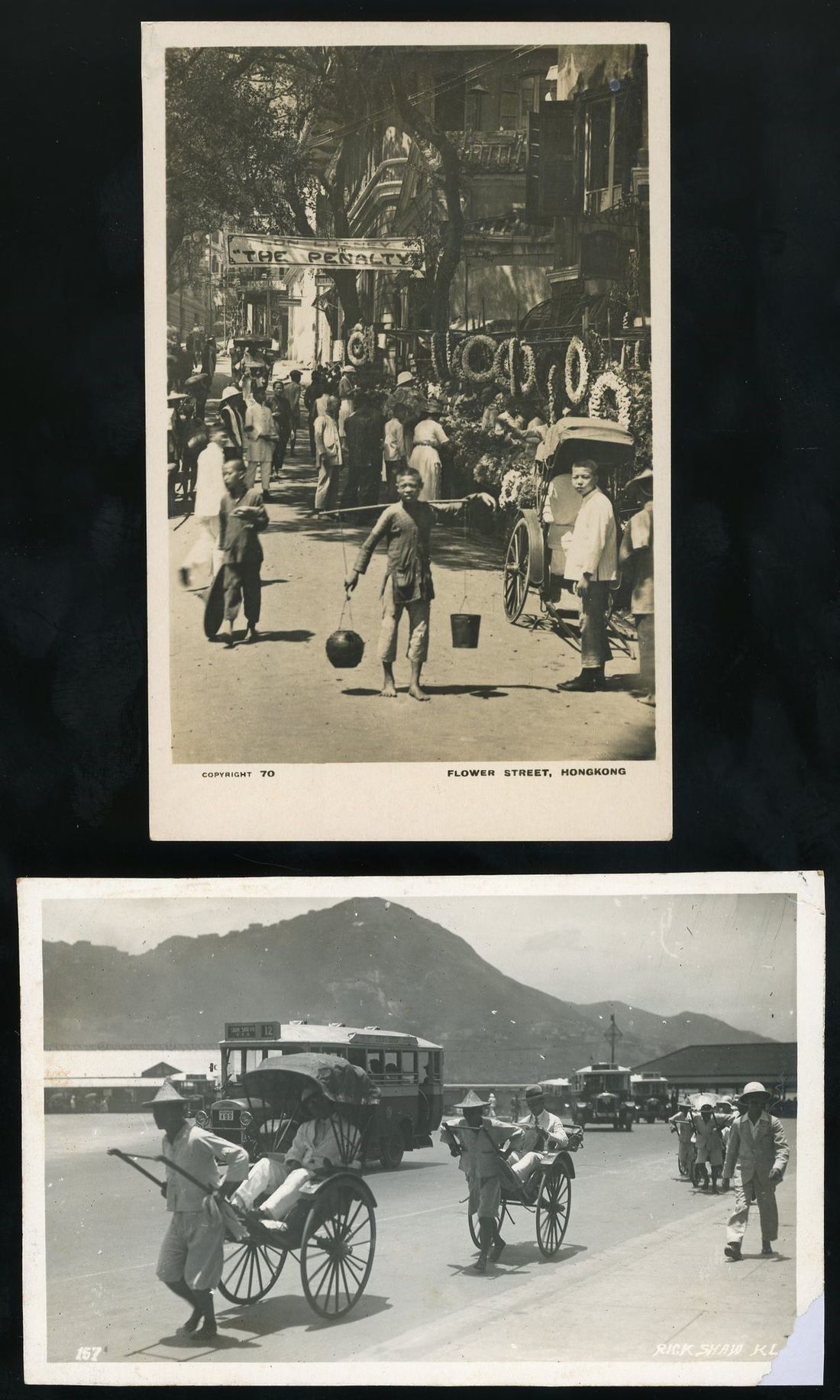 1930-1940年代照片版明信片两枚, 分別是九龍尖沙咀碼頭巴土站及香港擺花街.