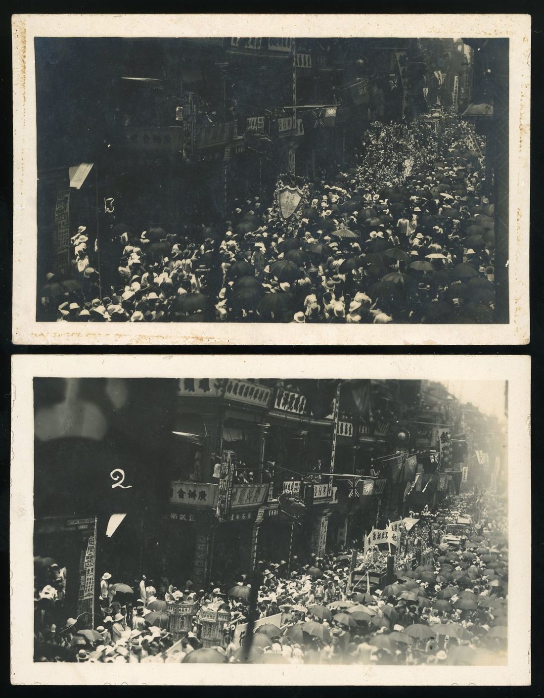 1935年英皇喬治五世登基銀禧紀念巡遊照片版明信片两枚, 請注意左邊牆上張貼的電影海報是在東方戲院上映的 "落花流水". 正好作為此巡遊明信片的拍攝時間.